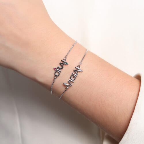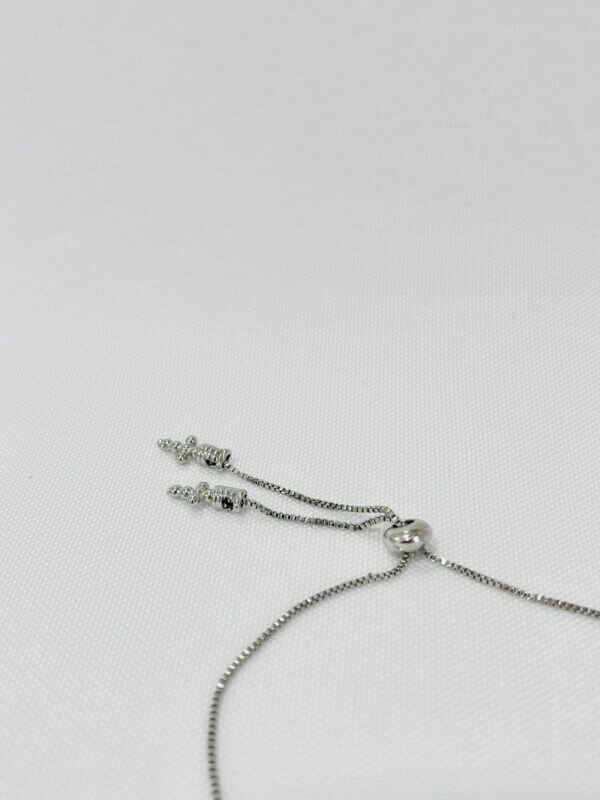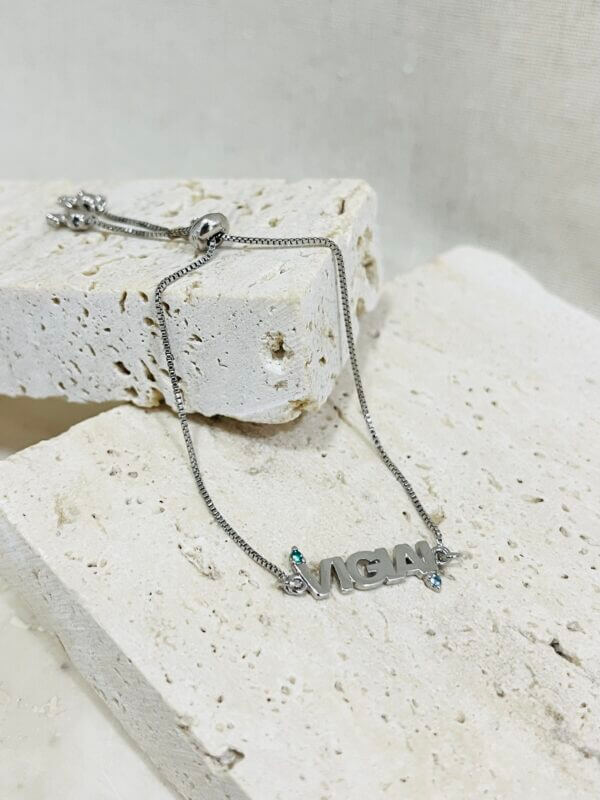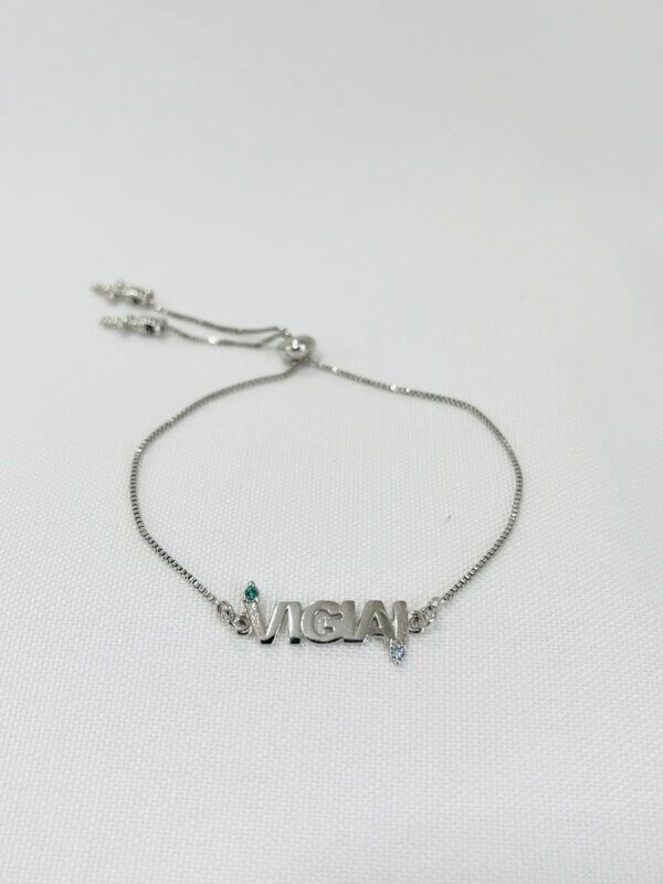 Pulseira Vigiai, em banho ródio branco, escrita fixa, com duas microzircônias, fecho ajustável.