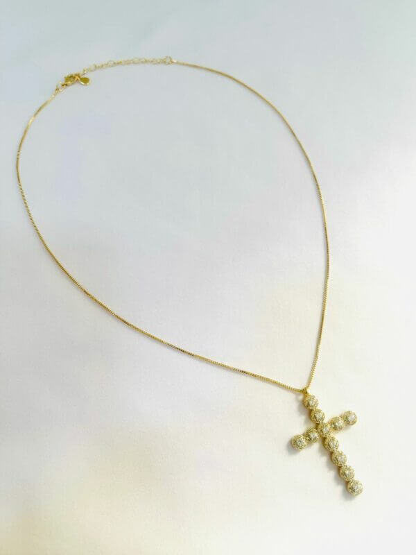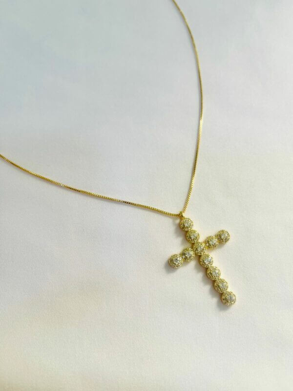 A corrente fina em tom dourado sustenta um pingente de cruz cravejado por pedras brilhantes, que refletem a luz com sutileza e sofisticação.