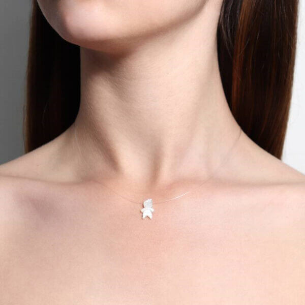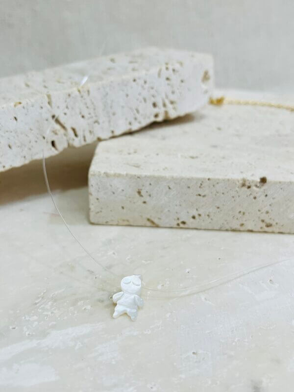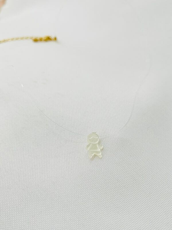 Colar em fio de nylon com pingente de filho em madrepérola, com detalhe do extensor e fecho em banho ouro.