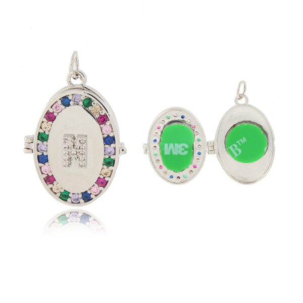 Relicário Felicidade, em banho ródio branco, pingente móvel de 2cm de altura e 1,8cm de comprimento, cravejado com zircônias: coloridas ou no cristal, corrente veneziana: curta 45-50cm ou longa de 70-90cm.