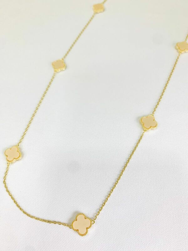 Colar Trevo, em banho ouro, vários trevos off white ao longo da corrente, 80cm de comprimento.